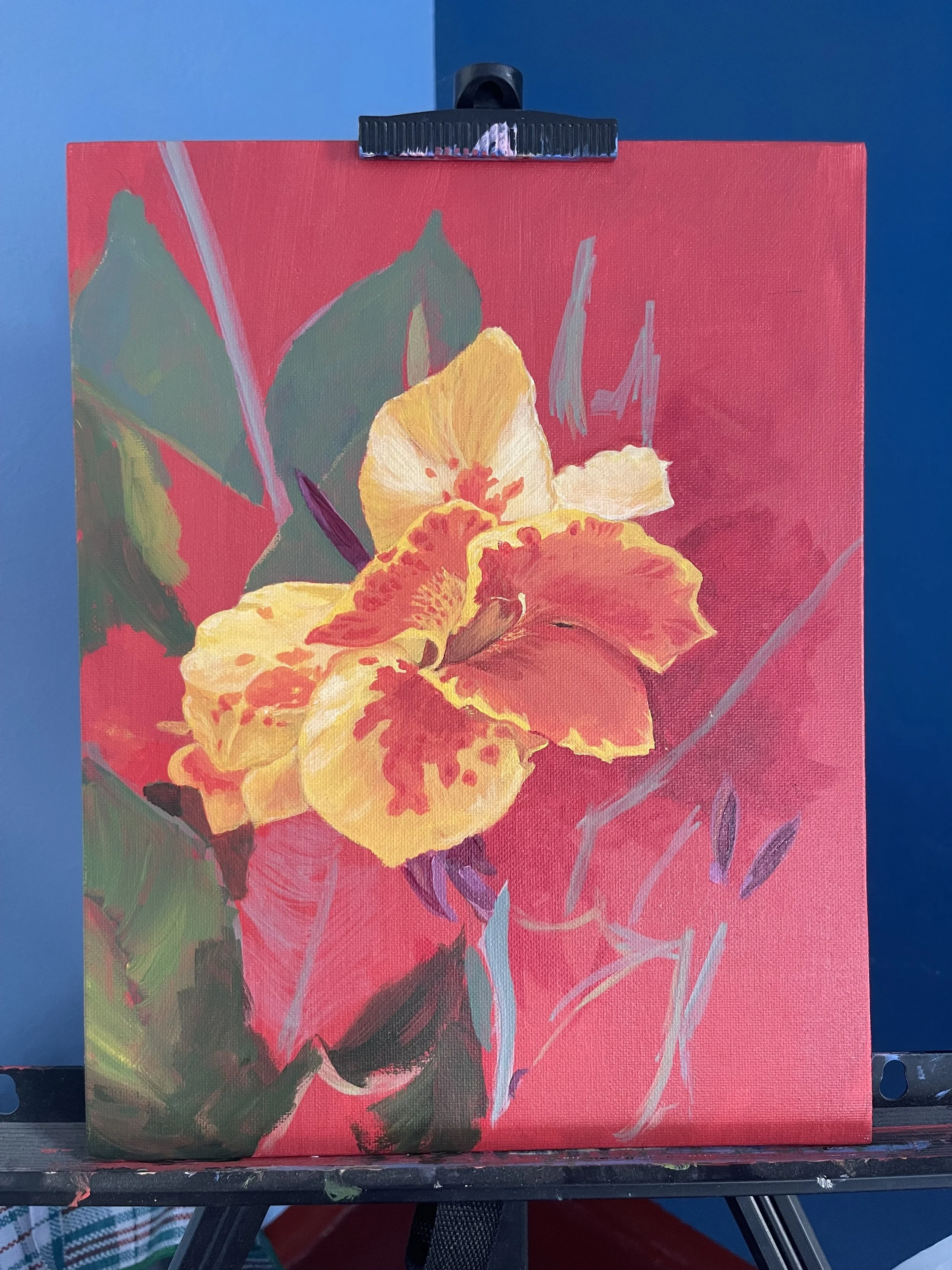 In a fit of despondency while doom scrolling, I dragged myself out of bed and decided to just…do…something…to fight…the inertia. I got up, squeezed some paint onto my stay-wet palette, and I painted. I smeared some green paint on the background to get things moving again. Here are the results…I’m feeling pretty good about this progress, despite the long pause.