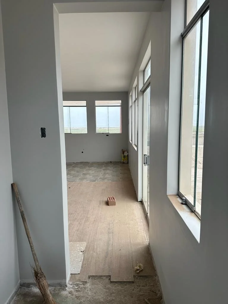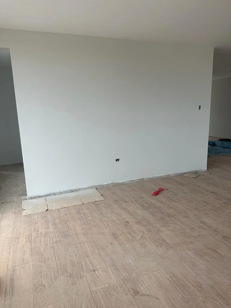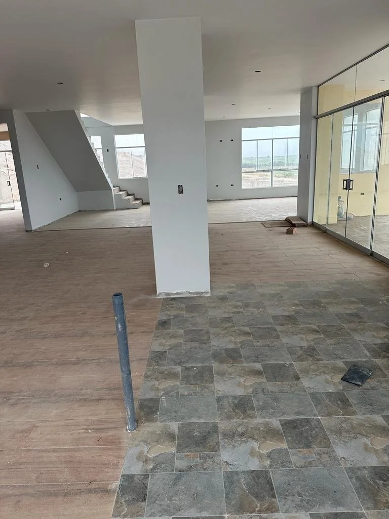 The grey stone-looking tile is the kitchen area, while the wood-grain looking tile to the left is the dining room area. The pipes coming up are where I hope to have my island with a sink in it.